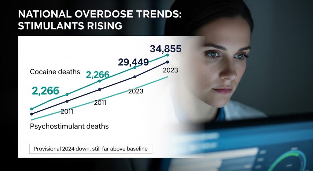 Stimulant-involved overdose deaths have surged since 2011. CDC surveillance data show that cocaine deaths rose from 4,681 in 2011 to 29,449 in 2023, and psychostimulant deaths (mostly methamphetamine) increased from 2,266 to 34,855 over the same period.
