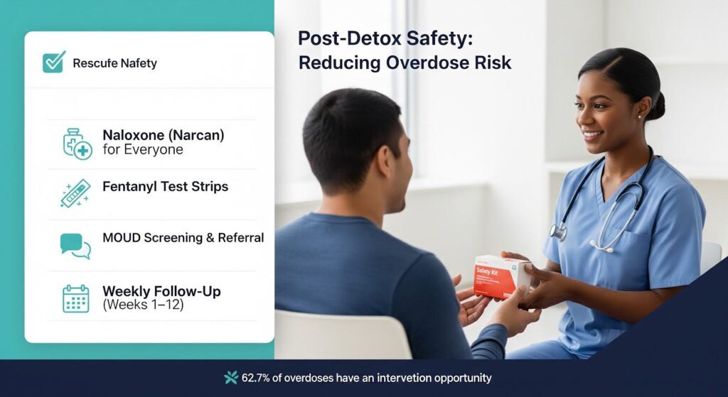 The period immediately after detox is the highest-risk window for fatal overdose. Comprehensive discharge planning should include: