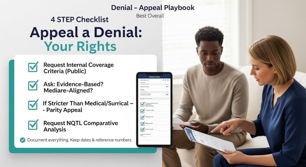 If the criteria diverge from Traditional Medicare coverage or apply more stringent standards to mental health and substance use than to medical/surgical services, challenge the denial under parity.