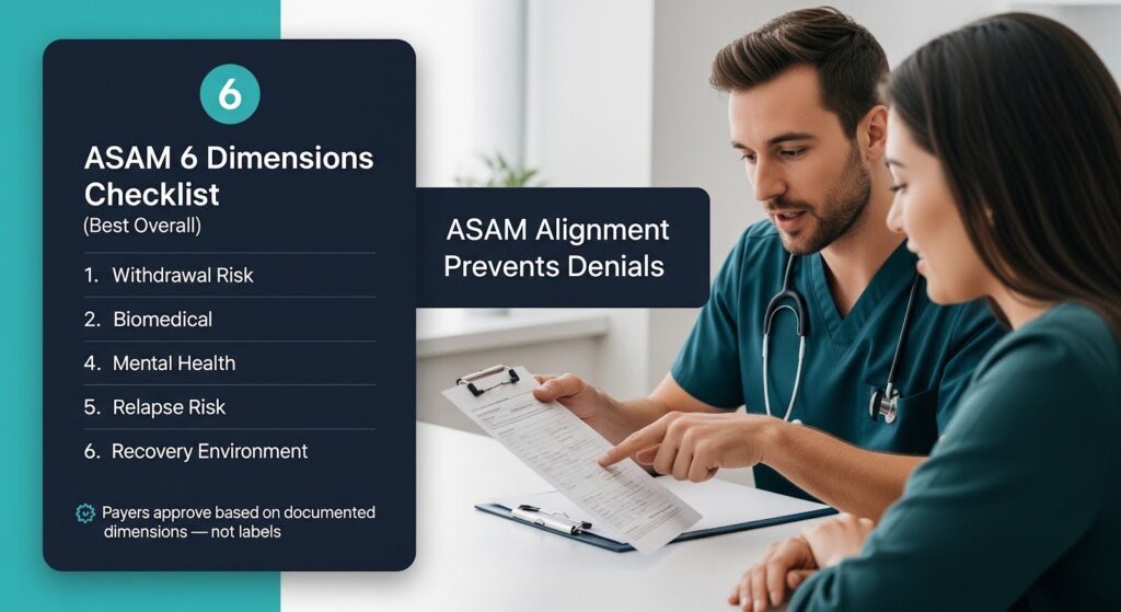 If you’re seeking intensive outpatient (IOP), partial hospitalization (PHP), residential, or detox services, your provider’s authorization request should address all six ASAM dimensions with specific evidence.