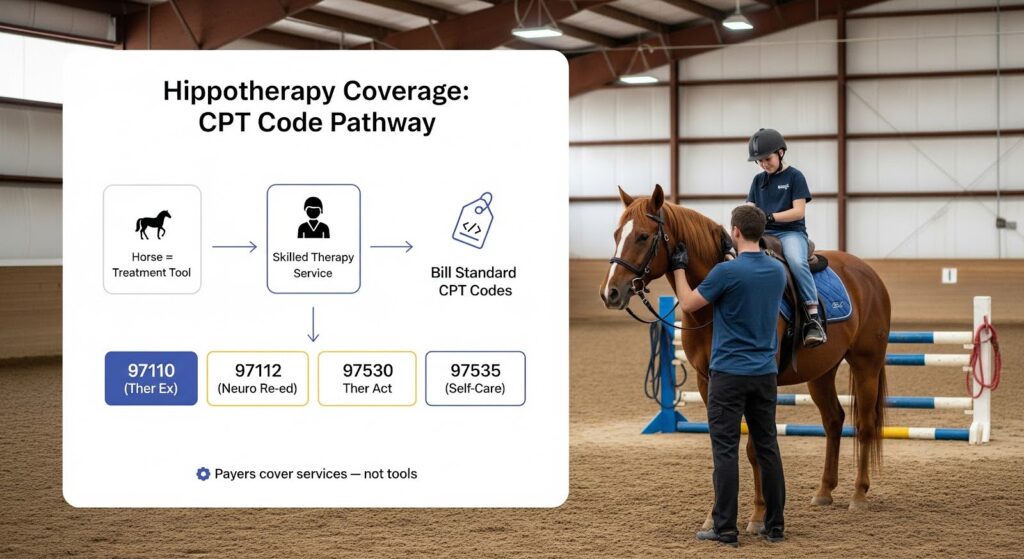 Correct coding posture is essential. Bill standard therapy CPT codes aligned to the skilled intervention and documented functional goals; do not code hippotherapy as a distinct service.
