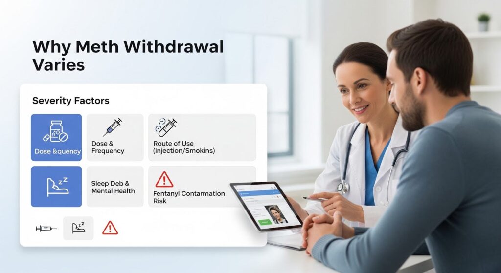 Symptom intensity and duration vary widely based on dose, frequency, route of use (smoking or injection versus oral), binge patterns, sleep debt, psychiatric comorbidities, and polysubstance exposure.