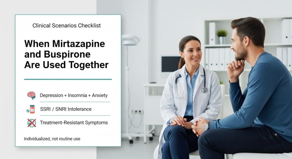 Depression with insomnia and daytime anxiety: When a patient needs help sleeping and gaining appetite from mirtazapine but still experiences daytime anxiety, buspirone may address the residual anxiety without adding sedation.