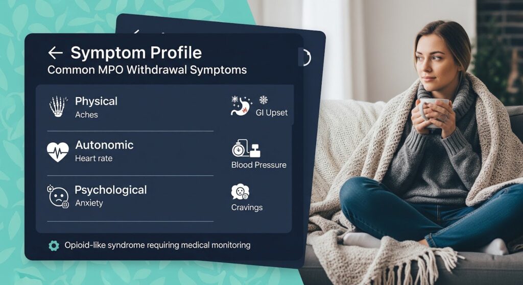Withdrawal from mitragynine pseudoindoxyl presents as an opioid-like syndrome. Because MPO is a potent mu-opioid receptor agonist, stopping regular use triggers the body’s compensatory mechanisms, producing uncomfortable and sometimes severe symptoms.