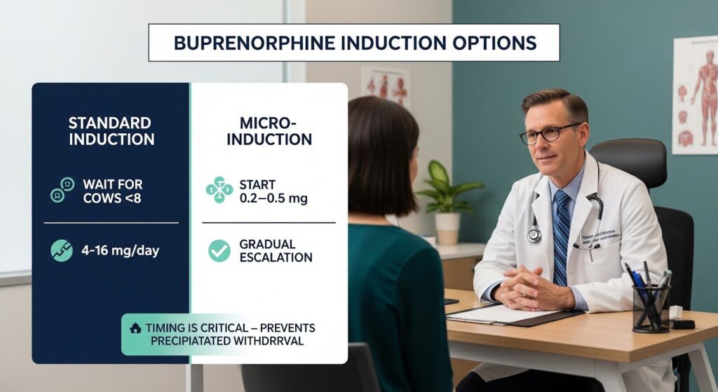 Standard induction involves waiting for COWS ≥8 to 12 (mild to moderate withdrawal) before the first buprenorphine dose.