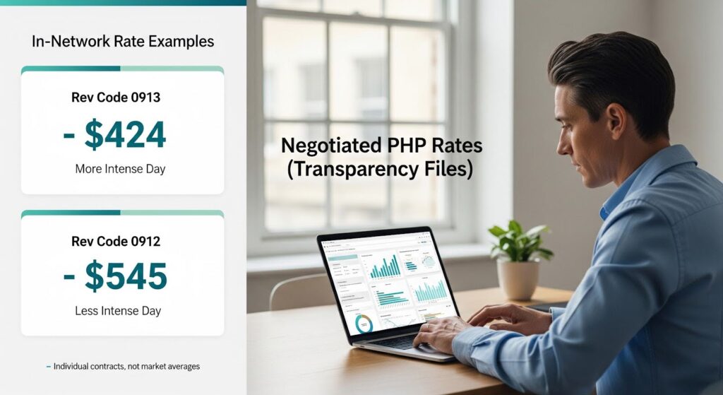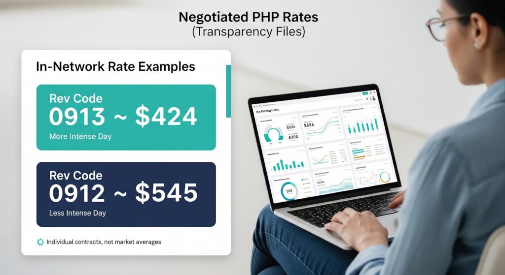 For PHP like revenue codes, examples visible in 2025 to 2026 files illustrate the order of magnitude. For revenue code 0913, often used commercially for more intense partial hospitalization, a UnitedHealthcare negotiated rate of $424.00 is displayed for a Massachusetts provider.